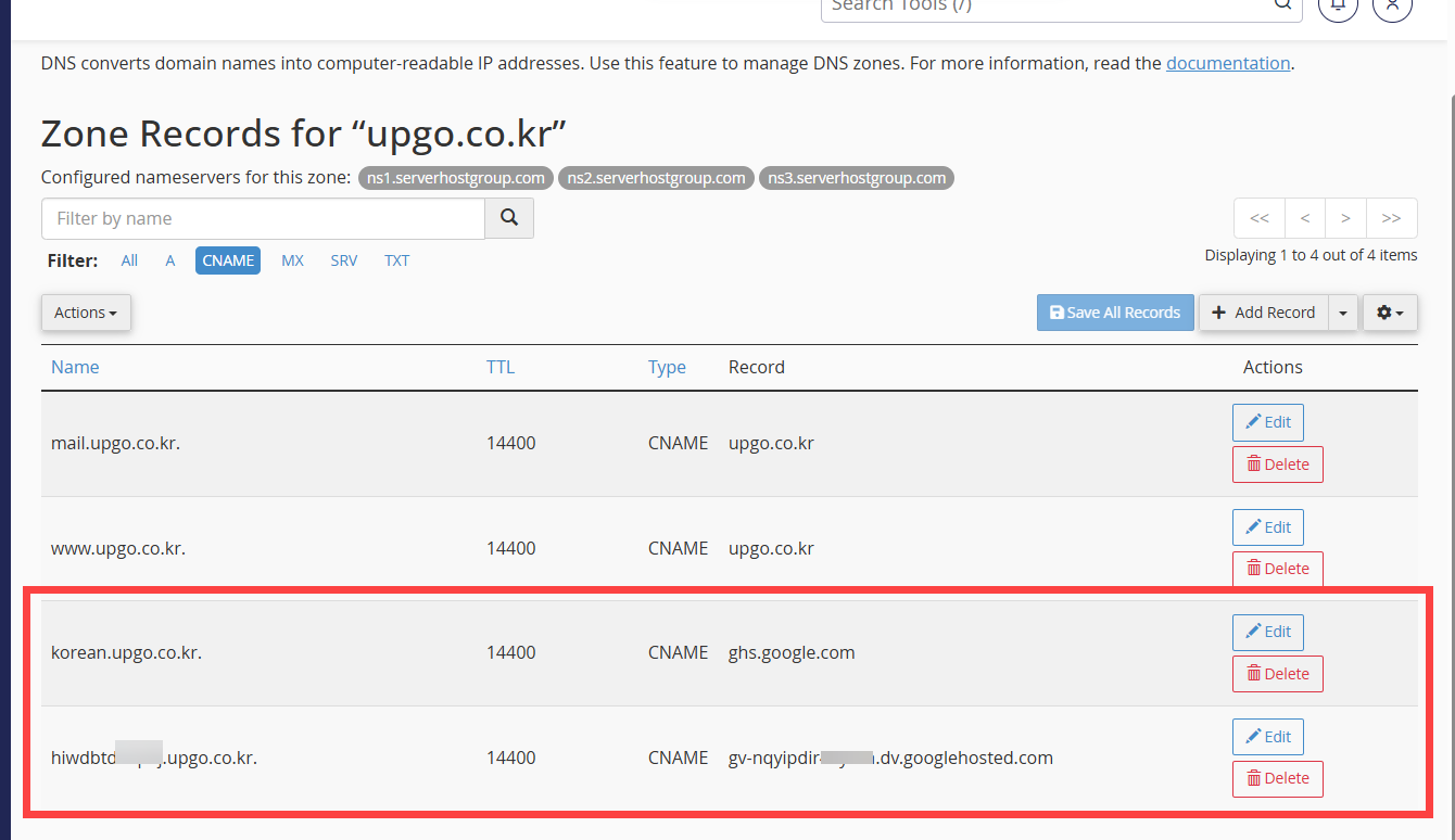 4. CNAME 레코드는 도메인의 네임서버가 지정된 곳에서 설정이 가능합니다.