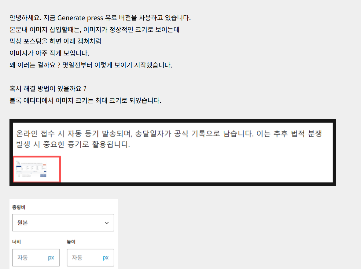 워드프레스 관련 네이버 카페에 GeneratePress 유료 버전이 설치된 워드프레스에서 이미지를 삽입하면 편집 화면에서는 정상이지만 발행된 게시글에서는 이미지가 작게 표시되는 문제가 나타나는 문제에 대해 한 사용자가 질문을 올렸습니다.
