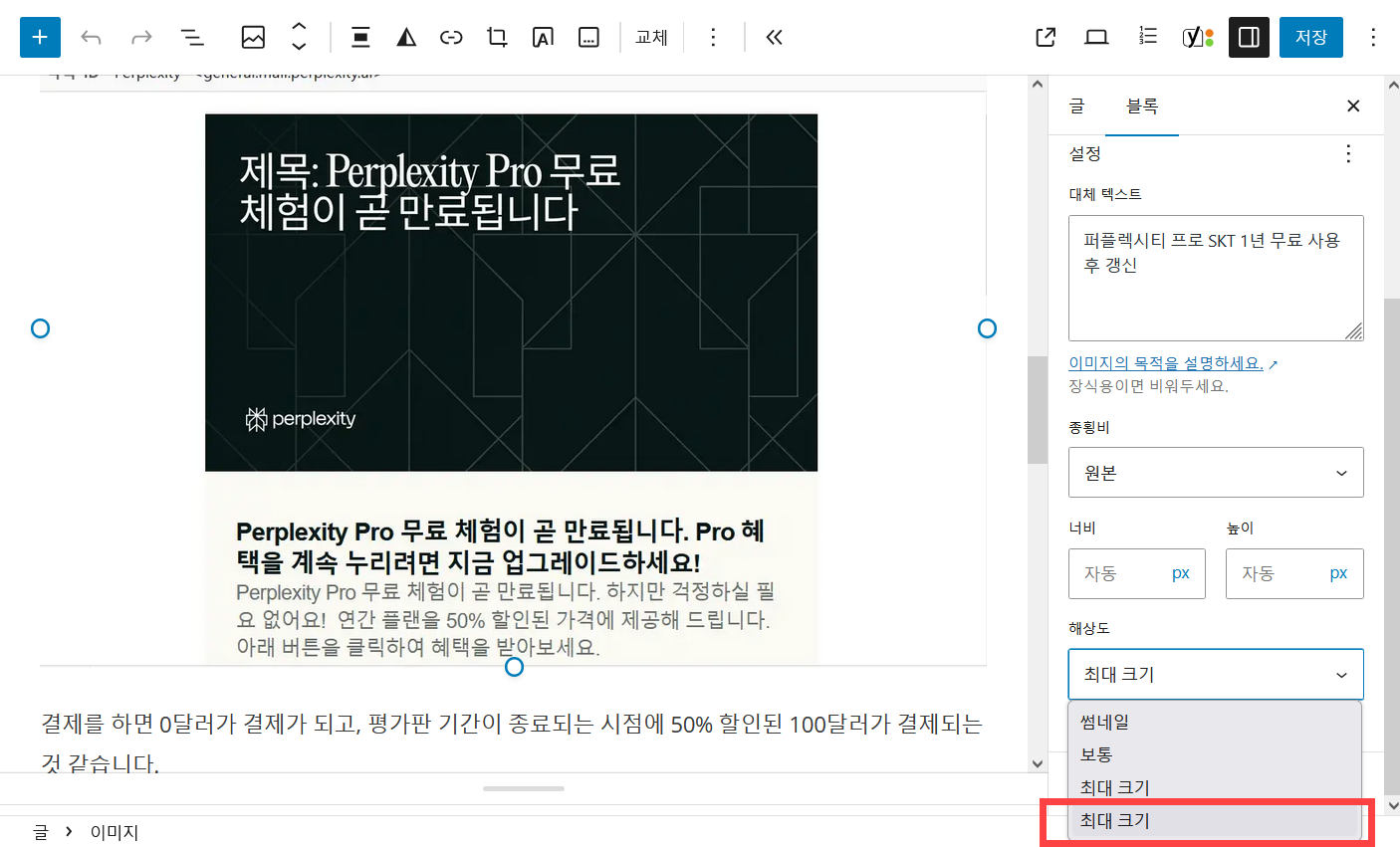 위와 같이 설정하면 블록 에디터 화면에서는 이미지가 제대로 표시되지만, 포스팅 후에 실제로 글을 확인하면 이미지 크기가 작게 추가되는 문제인 것 같습니다.