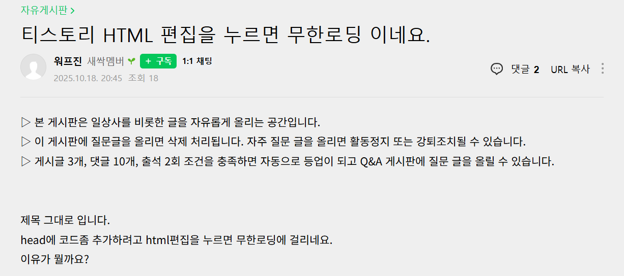 티스토리 HTML 편집 페이지를 열면 무한 로딩 오류
