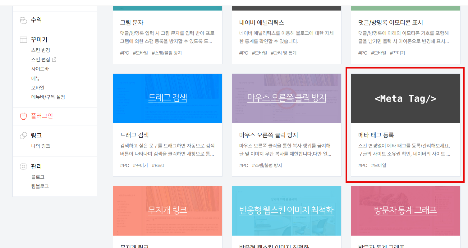 참고로 구글, 네이버에서 사이트 소유권 확인을 위해 메타 태그를 입력해야 하는 경우, 스킨 편집을 할 수 없는 상황에서는 티스토리가 제공하는 메타 태그 등록 플러그인을 사용하여 소유권 확인 메타 태그를 등록할 수 있습니다.