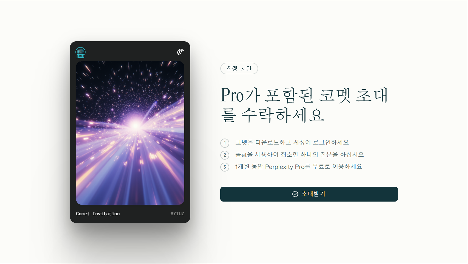 초청 링크를 클릭한 후에 코멧을 다운로드하고 코멧에서 최소 1개의 질문을 하면 1개월 동안 Perplexity Pro를 무료로 사용할 수 있습니다.