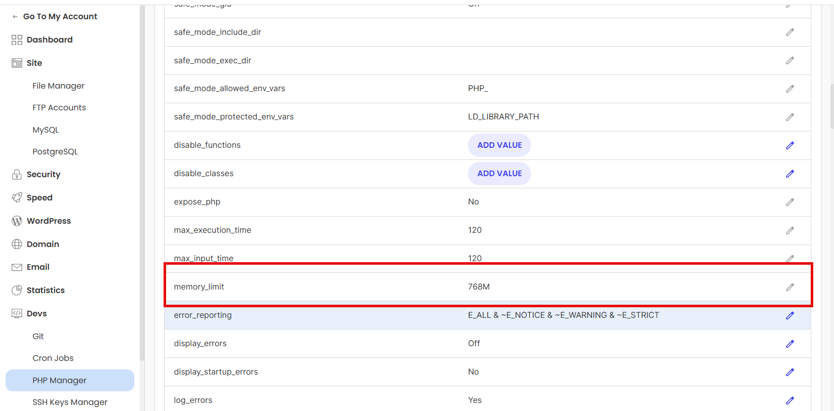 사이트그라운드는 Memory Limit 값이 768MB로 고정되어 있고 이 값에서는 대부분의 상황에서 메모리 부족 문제가 발생하지 않을 가능성이 높습니다.