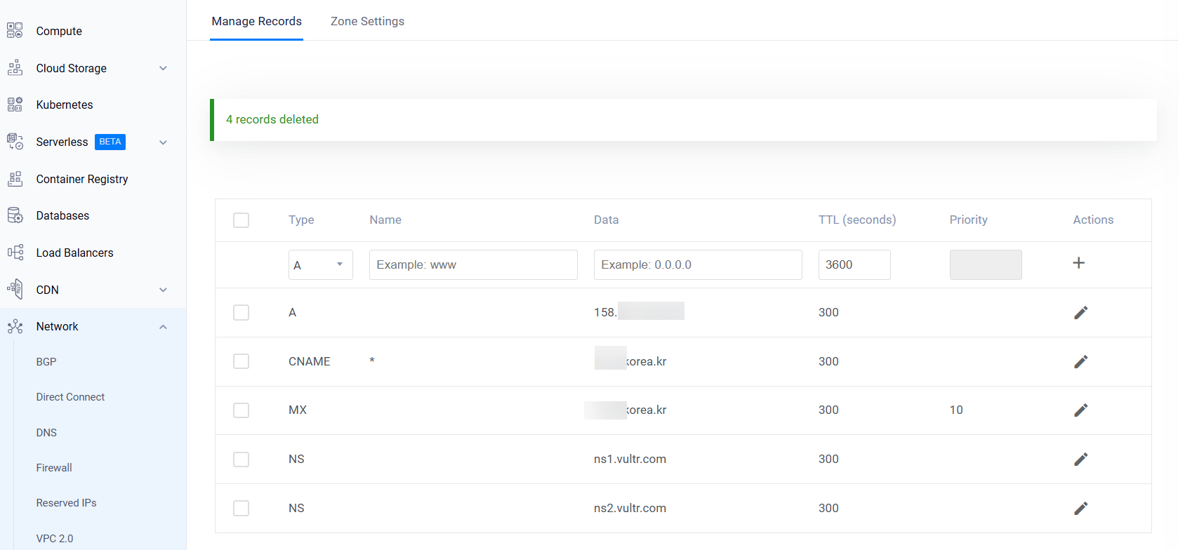 참고로 Vultr에 도메인을 연결하면 다음 그림과 같이 DNS 레코드가 설정됩니다.