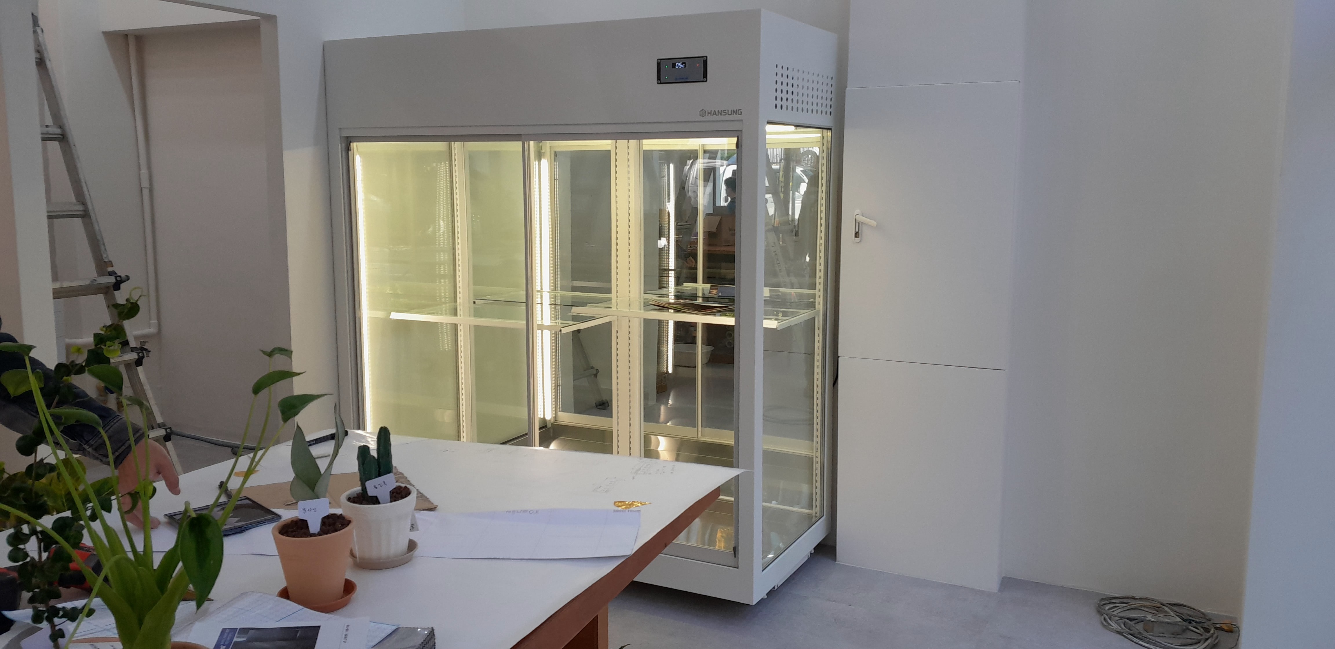 오픈 초창기에는 가정용 냉장고와 스탠드형 진열장을 병용했습니다. 비용을 아끼려는 선택이었지만 문제는 금방 드러났죠.