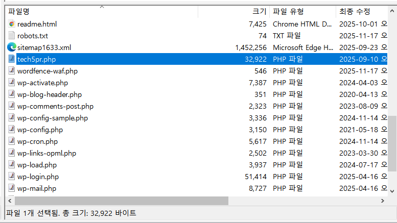 위의 그림에서 tech5pr.php 파일이 확실히 이상한 이름의 파일로 백도어 역할을 하는 악성코드로 의심됩니다. 그리고 sitemap1633.xml이라는 다소 이상한 사이트맵 파일이 있는데, 일본어 키워드 스팸 해킹 피해를 입은 사이트에서 이런 사이트맵 파일이 발견되는 것 같습니다. 이러한 이상한 사이트맵 내의 항목들이 구글 등 검색엔진에 노출될 수 있습니다.