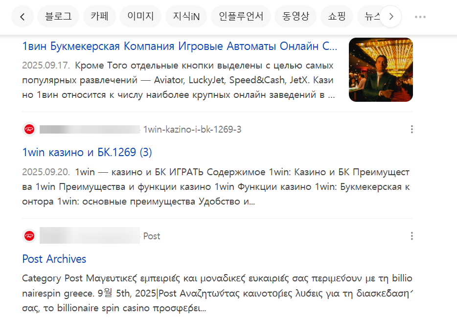 네이버에서도 검색해보니 네이버에서는 한글 콘텐츠가 앞쪽에 표시되었고, 뒤쪽에서 러시아어와 그리스어 등의 스팸 콘텐츠가 검색되었습니다.