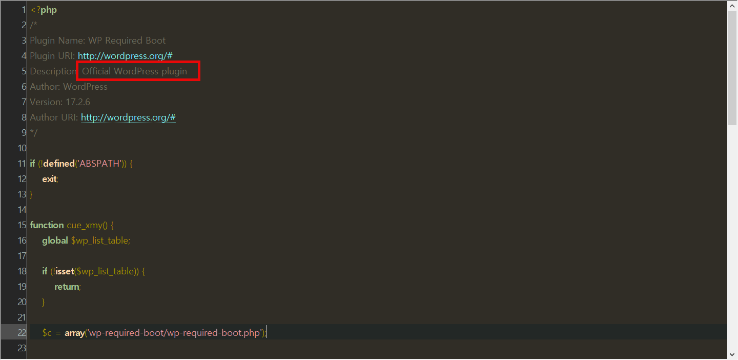 WP Required Boot이라는 플러그인의 파일을 열어보면 Official WordPress plugin(공식 워드프레스 플러그인)이라고 설명하지만 당연히 멀웨어입니다.