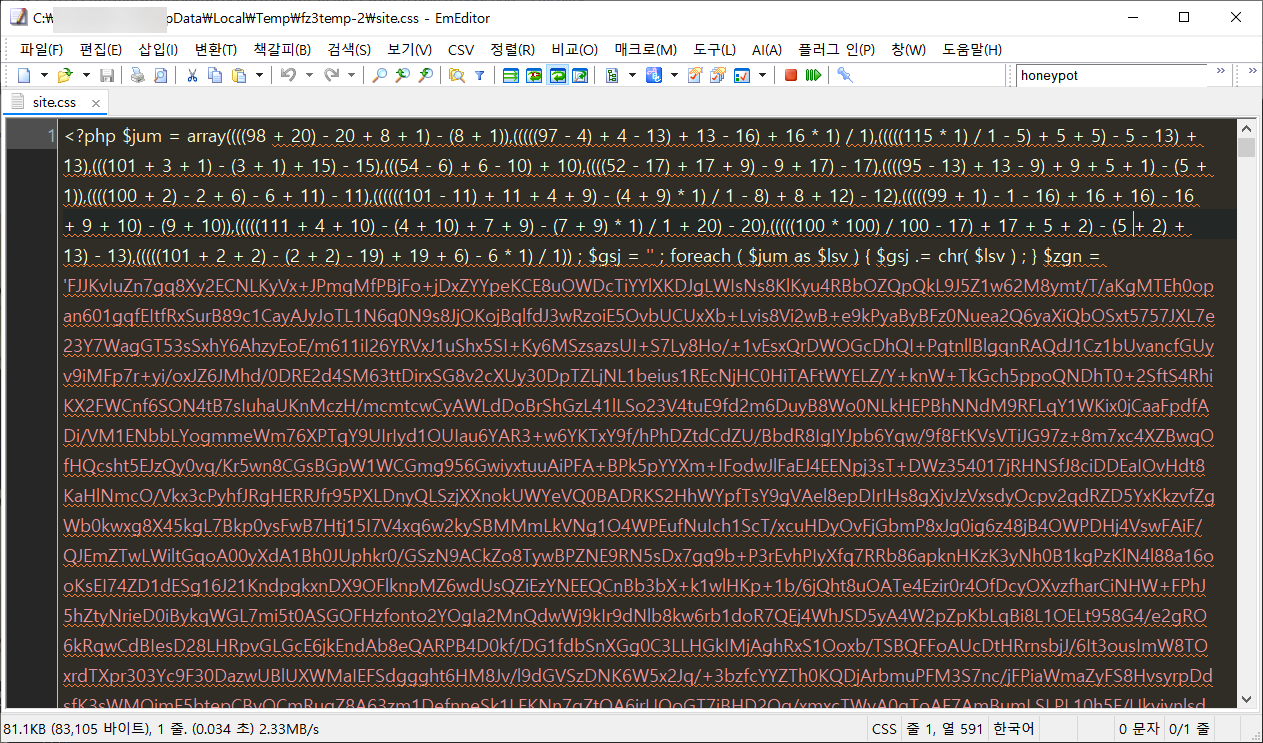 이런 플러그인은 특이하게 site.css 파일을 로드하는데, css 파일 내에 악성코드가 심어져 있습니다.