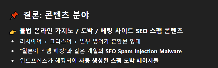외국어로 된 콘텐츠를 복사하여 챗GPT에 물어보니 불법 온라인 카지노/도박/베팅 사이트에 대한 SEO 스팸 콘텐츠라고 하네요. 네이버에서는 러시아어, 그리스어, 일부 영어가 혼합된 형태이고 불법적인 스팸 콘텐츠가 검색 결과에 표시되는 반면, 구글에 노출되고 있는 일본어 콘텐츠의 경우 일본어 기반 중고거래·리셀 상품 스팸(쇼핑 스팸)으로 분야가 조금 다르네요.