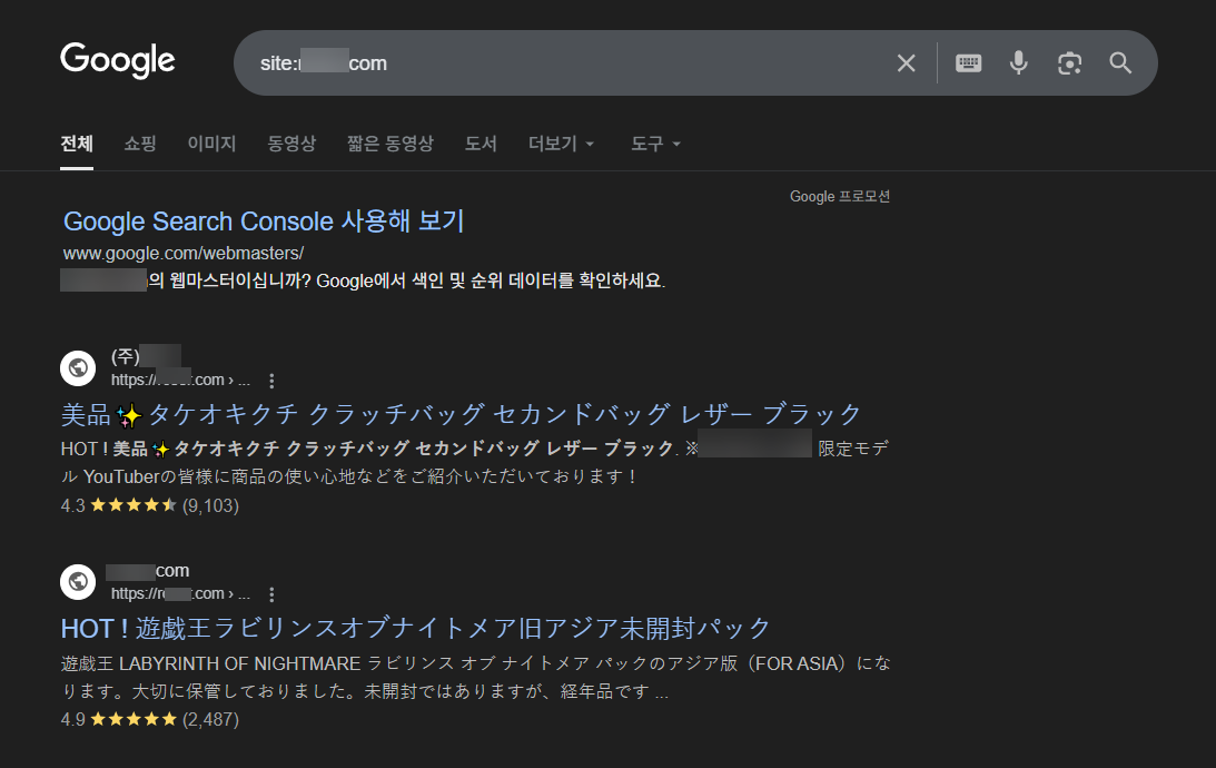 구글 검색엔진에서 문제의 사이트 도메인으로 검색해보니 해당 사이트 주소로 일본어 스팸 콘텐츠가 노출되고 있었습니다.😥