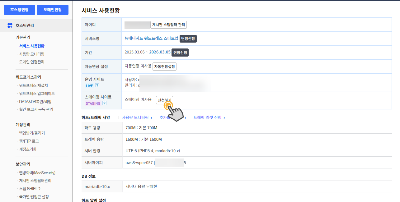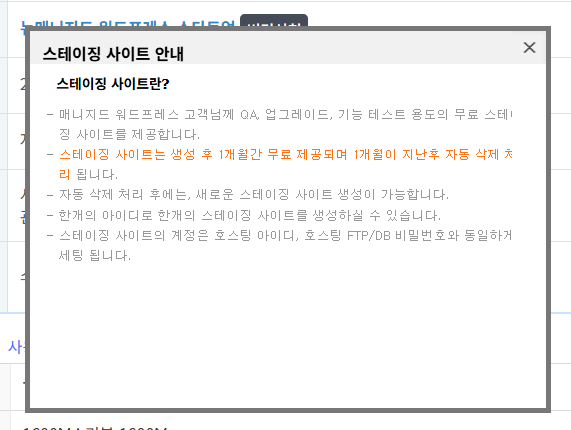 스테이징 사이트는 생성 후 1개월간 무료 제공되며 1개월이 지난 후 자동 삭제 처리됩니다.