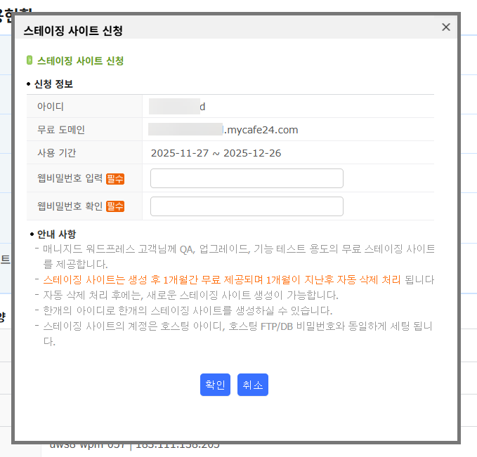 스테이징 사이트를 신청하면 FTP/DB 비밀번호를 설정하고 웹비밀번호를 설정하게 됩니다.