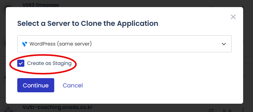 애플리케이션이 복제될 서버를 선택하는 팝업이 표시되면, 서버(현재 이용 중인 서버와 동일한 서버)를 선택하고 Continue를 눌러 앱을 복제하거나, Create as Staging을 체크하여 스테이징 사이트를 만들 수 있습니다.