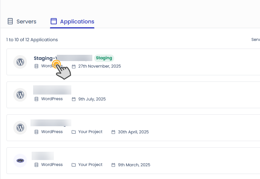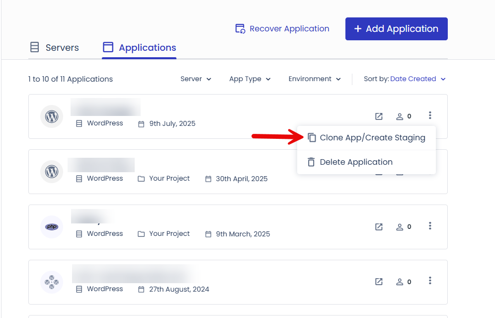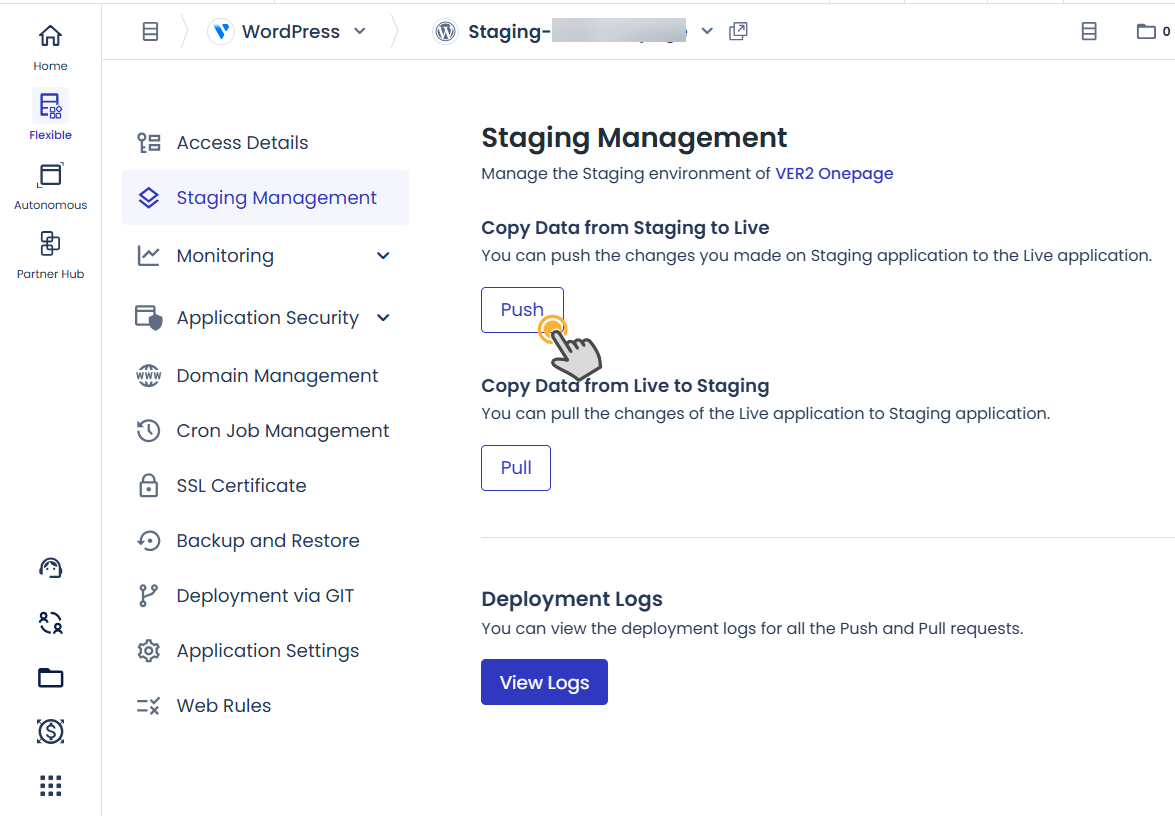 스테이징 사이트로 복제한 경우 애플리케이션 이름 앞에 "Staging-"이 붙습니다.