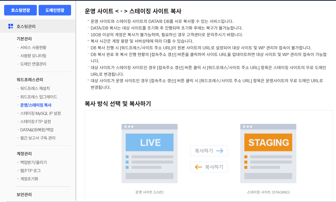 스테이징 기능을 사용할 수 없는 경우 사이트를 복제하여 임시 사이트를 만들어서 신규 제작이나 리뉴얼 작업 후에 현재 운영 중인 사이트로 이전하거나 신규 제작 또는 리뉴얼된 사이트로 도메인을 연결하는 것을 생각할 수 있습니다.