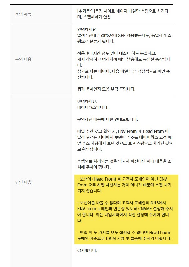 이와 관련하여 재차 네이버웍스에 문의하니 '메일 수신 로그 확인 시, ENV From과 Head From이 달라 모르는 서버에서 보낸이 주소를 네이버웍스 고객 메일 주소 사칭해서 보낸 것으로 보고 스팸으로 처리된 것으로 확인'된다는 답변을 해주었습니다.😥