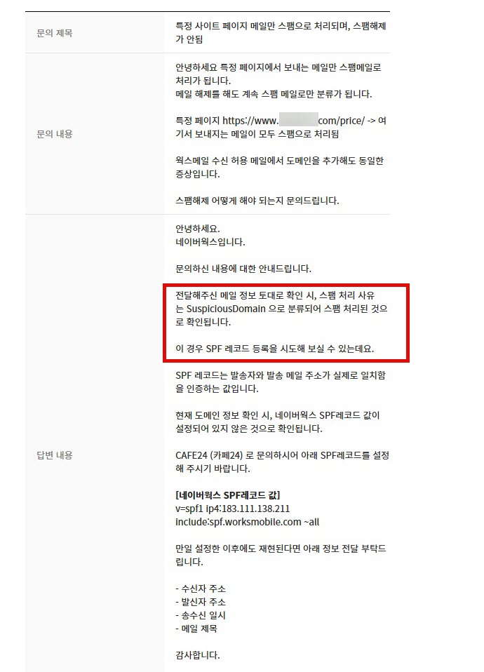 이 문제에 대하여 네이버웍스에 문의하니 스팸 처리 사유는 SuspiciousDomain으로 분류되어 스팸 처리된 것으로 확인되니 SPF 레코드 등록을 시도해 보라고 알려주었습니다.