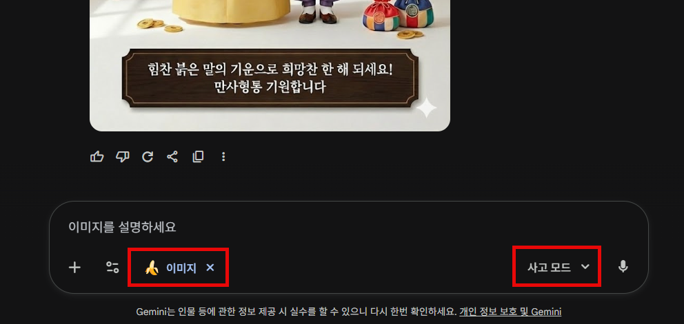 참고로 나노 바나나 프로로 이미지를 생성하려면 도구에서 '이미지 생성하기'를 선택하고 오른쪽 모델에서는 '사고 모드(3 Pro 사용)'를 선택해야 합니다. 빠른 모드를 선택하면 기존 버전을 사용하여 이미지를 생성하므로 이미지 퀄리티도 떨어지고 한글 철자 오류가 발생하게 될 것입니다.