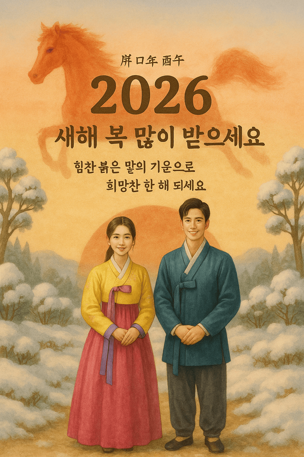 테스트로 챗GPT Plus와 Gemini Pro에서 각각 동일한 참고 이미지를 업로드하고 그것을 바탕으로 2026년 새해 인사말 이미지 생성을 요청해 보았습니다.