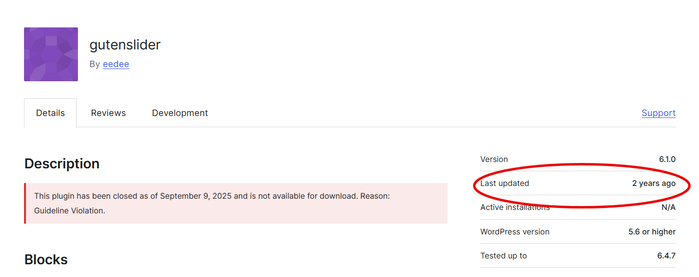 Gutenslider 플러그인은 2025년 9월 9일에 가이드라인 위반으로 워드프레스 플러그인 저장소에서 삭제되었으며, 정확한 이유는 알 수 없는 상태입니다. 보통 보안 문제로 플러그인이 제거되는 경우가 많습니다.