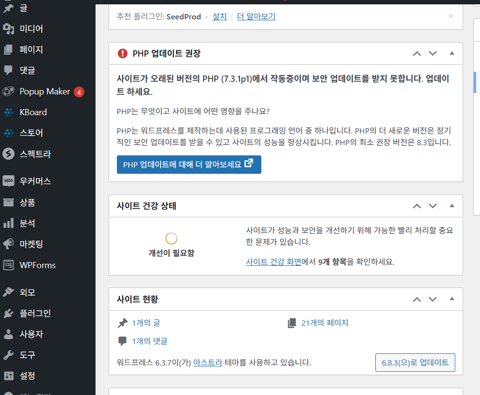 PHP 버전의 경우 워드프레스에서 8.3 이상을 권장하고 있고, 최소한 7.4 이상을 사용해야 제대로 워드프레스 사이트를 운영할 수 있습니다.