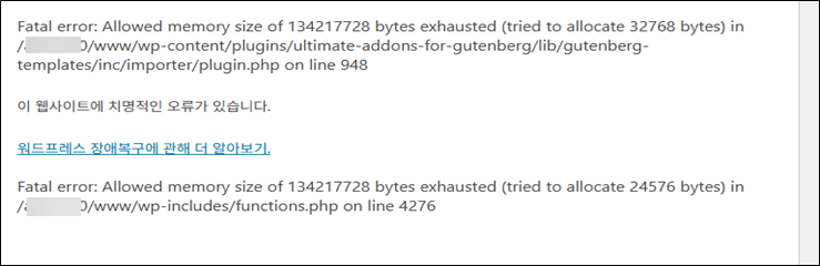 그리고 메모리 부족 문제는 PHP 메모리 크기를 늘리고, 메모리를 많이 소모하는 플러그인을 찾아서 제거하거나 사이트를 최적화하는 등의 작업도 고려할 수 있습니다.