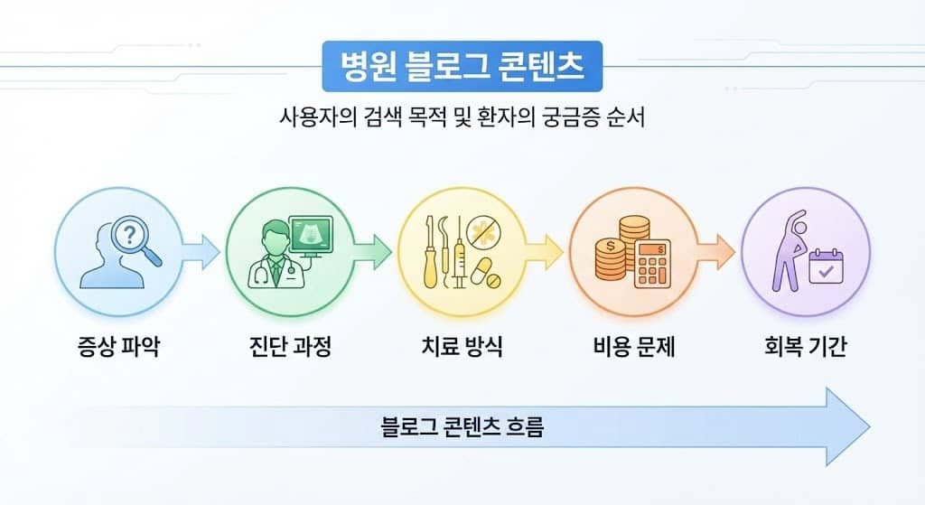 병원 블로그 콘텐츠는 사용자의 검색 목적에 정확하게 대응해야 합니다. 증상 파악, 진단 과정, 치료 방식, 비용 문제, 회복 기간 등 환자가 궁금해하는 순서를 그대로 반영해야 합니다.