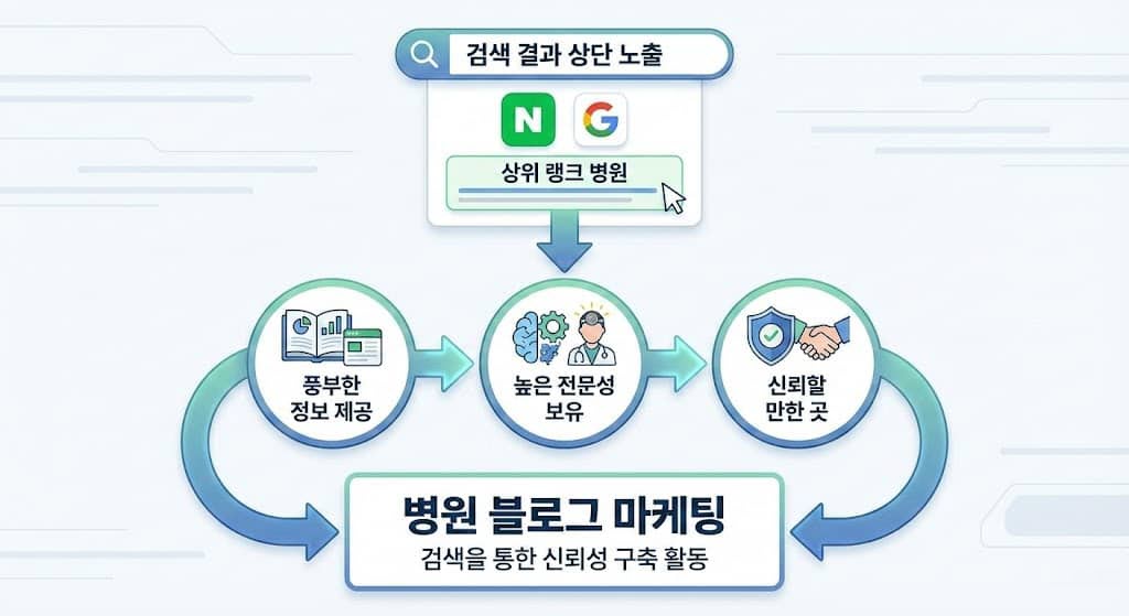 특히 네이버나 구글 검색 결과 상단에 위치한 의료 기관은 "풍부한 정보 제공 → 높은 전문성 보유 → 신뢰할 만한 곳"이라는 인식 경로를 만들어냅니다. 그러므로 병원 블로그 마케팅은 검색을 통한 신뢰성 구축 활동으로 이해하는 것이 적절합니다.