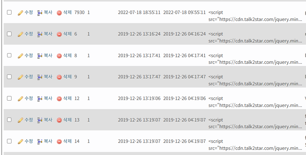 데이터에서 악성코드를 모두 제거한다고 문제가 해결되는 것은 아닙니다. 경우에 따라 DB에 악성 스크립트가 주입되기도 합니다. 문제의 사이트의 DB를 스캔하니 아래 그림과 같이 <script src="https://cdn.talk2star.com/jquery.min.js"></script> 스크립트가 4000개 이상이 DB에 추가된 것을 확인할 수 있었습니다.