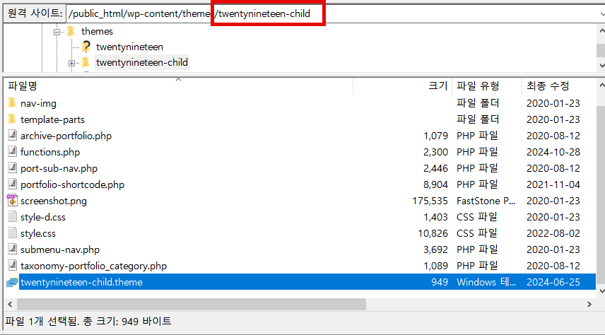 그러면 twentynineteen-child.theme 파일은 어디에 있는 것일까요? 찾아보니 Tweny-Nineteen의 차일드 테마 폴더 아래에 있네요.😄