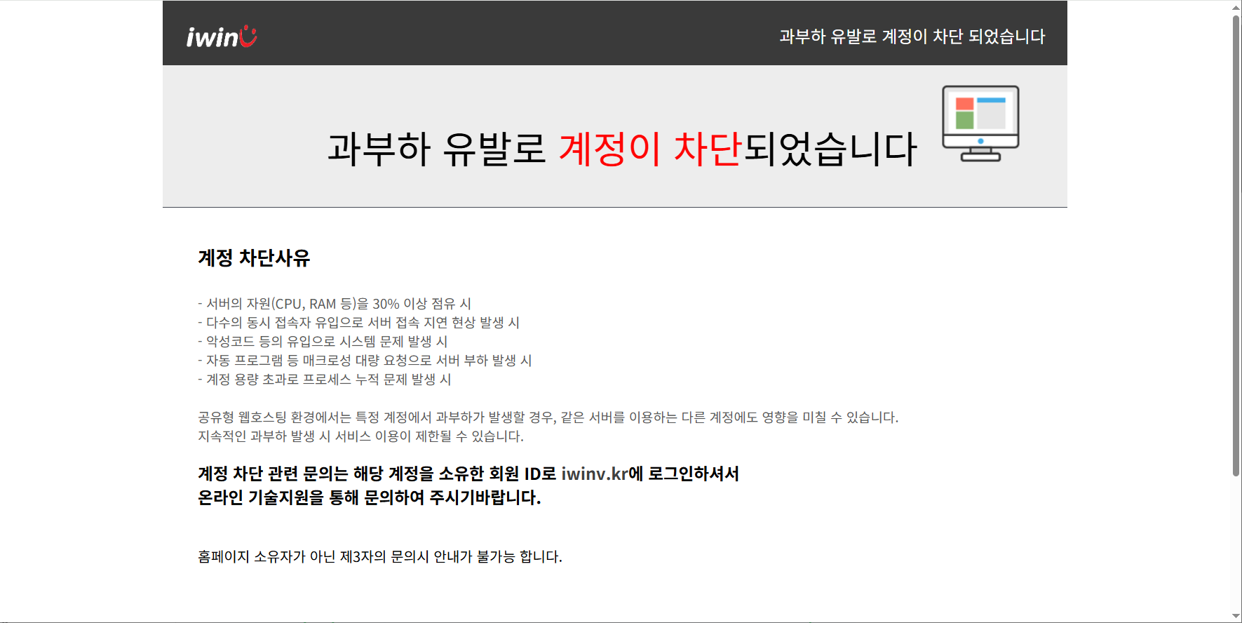 멀웨어 감염으로 인해 워드프레스 사이트가 웹호스팅 업체에 의해 계정이 차단된 문제 해결을 의뢰받아 진행했습니다. 사이트에 접속하면 '과부하 유발로 계정이 차단되었습니다' 경고가 표시되면서 사이트 접속이 차단된 상태였습니다.