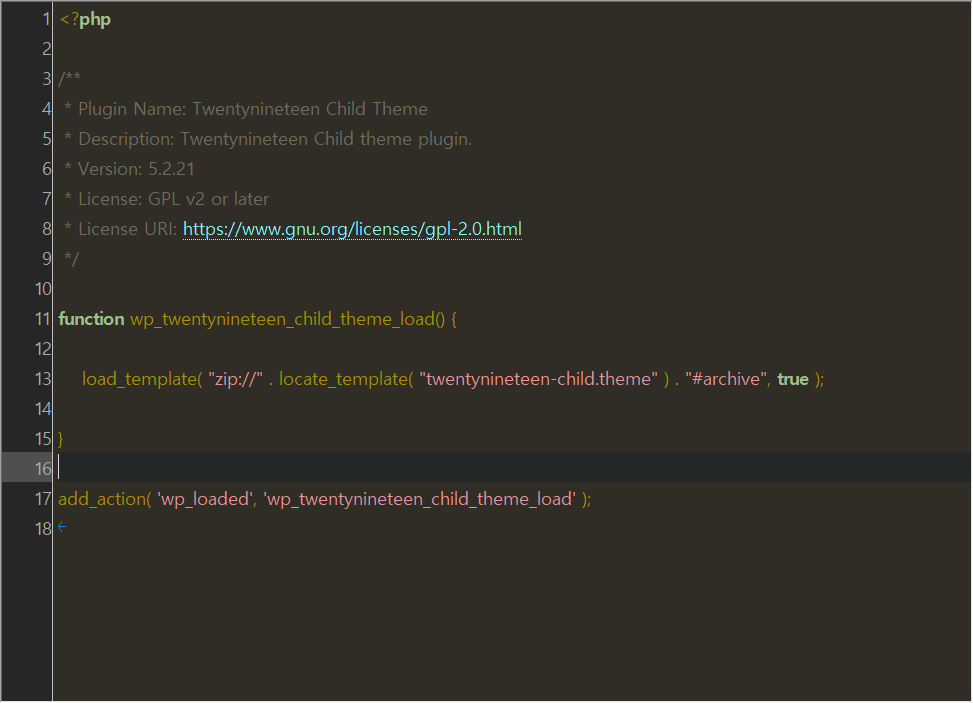 이 코드는 겉으로는 “테마용 플러그인”처럼 보이지만, 실제로는 숨겨진 파일(twentynineteen-child.theme) 안의 코드를 불러와 실행하는 로더 역할을 합니다.