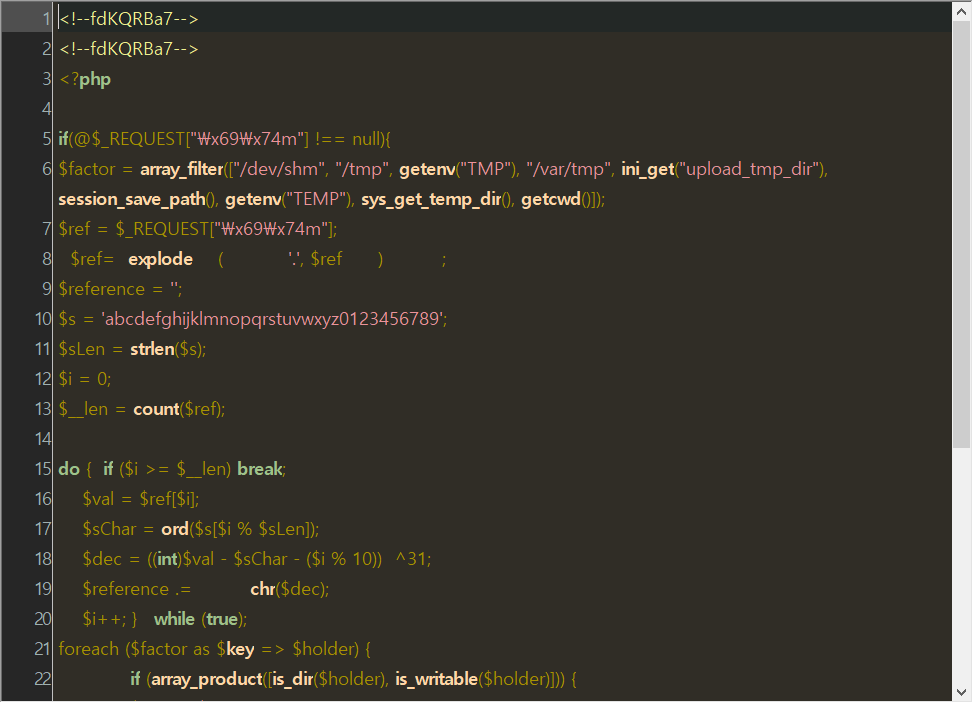 또한 변수명과 파라미터 이름을 \x69\x74m 같은 16진수 이스케이프와 복잡한 연산으로 의도적으로 난독화해 사람이 코드를 읽고 이해하기 어렵게 만들어 두었습니다. 실행이 끝난 후 임시 파일을 바로 삭제하는 방식도 흔적을 숨기려는 전형적인 멀웨어 패턴입니다. 이런 점들을 종합하면, 이 코드는 정상 기능이 아니라 서버에 몰래 심어진 악성 백도어 코드로 보는 것이 타당합니다.