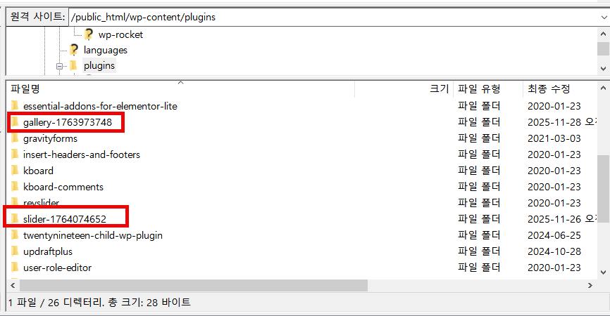 gallery-1763973748과 slider-1764074652와 같이 플러그인 폴더 이름에 이상한 숫자가 포함되어 있었습니다. 파일 내용을 살펴보면 100% 멀웨어라는 것을 알 수 있었습니다.