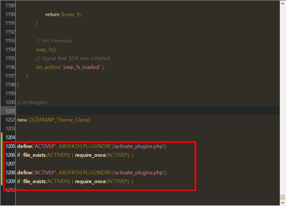 OceanWP 테마의 함수 파일을 열어 살펴보니 아래와 같이 맨 끝에 동일한 코드가 중복되어 삽입되어 있었습니다.