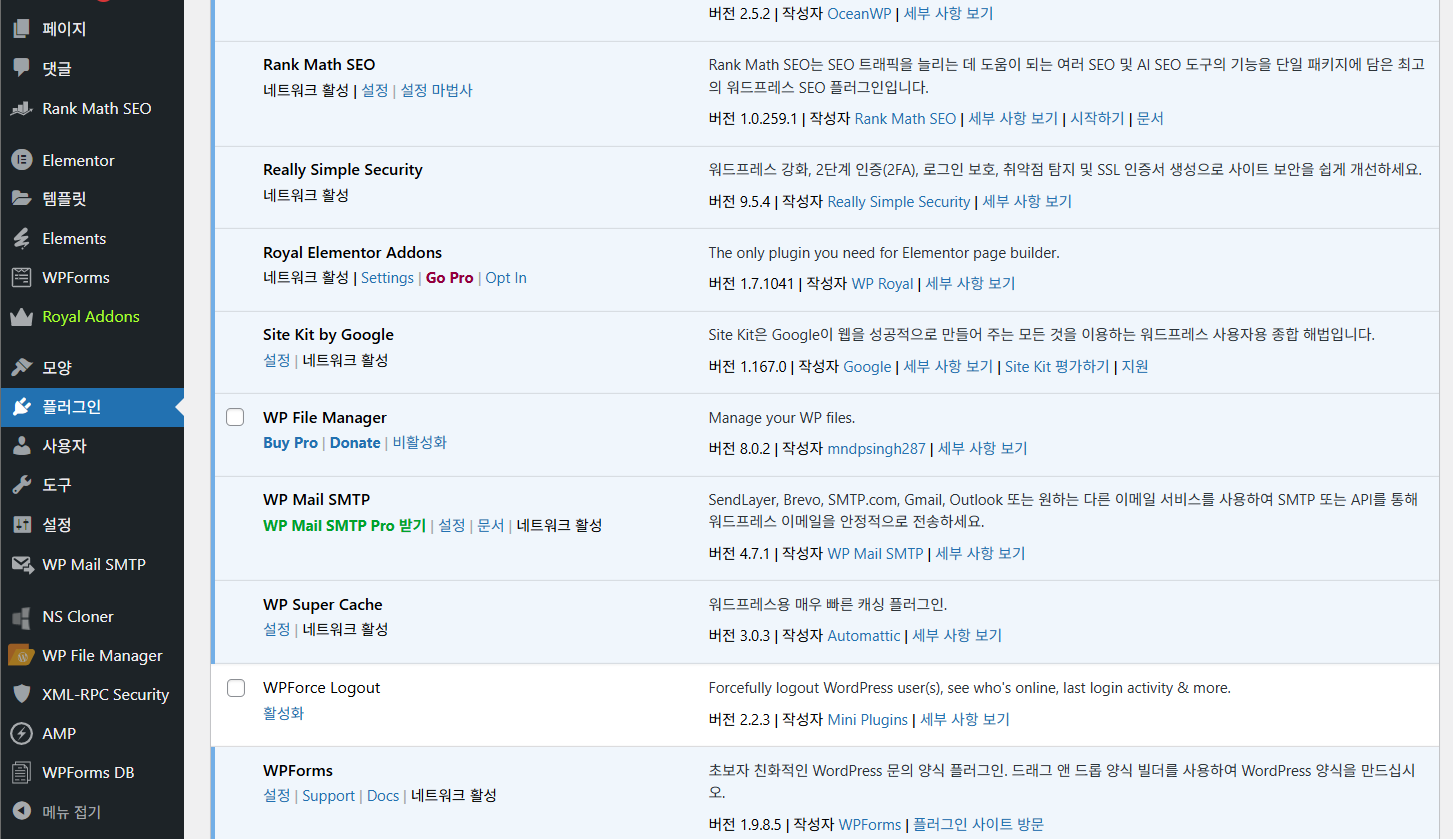 그리고 엘리멘터와 엘리멘터용 애드온 플러그인인 Royal Elementor Addons 플러그인을 비롯하여 다양한 플러그인이 설치되어 있었습니다.
