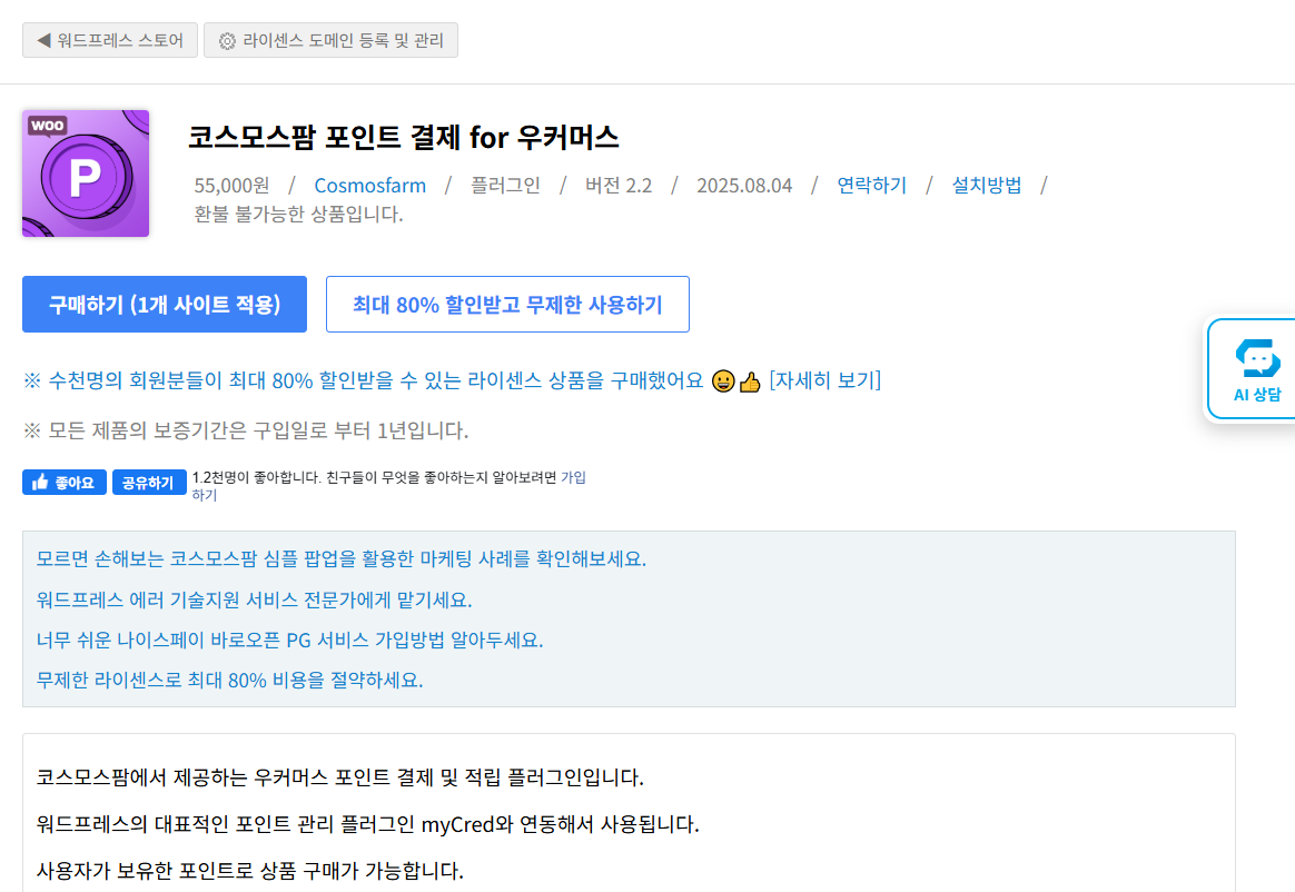 이 플러그인은 1개 사이트 적용 라이선스가 55,000원에 판매되고 있으며 보증기간이 1년입니다. 계속 업데이트와 지원을 받으려면 매년 결제를 해야 합니다. (요즘은 대부분의 플러그인이 연간 구독제로 판매되고 있습니다. 예를 들어, 엘리멘터 페이지 빌더의 경우 초기에는 평생 라이선스가 있었지만, 단종되고 지금은 연간 구독형 라이선스만 판매되고 있으며 적용 사이트 개수에 따라 비용이 다릅니다.)