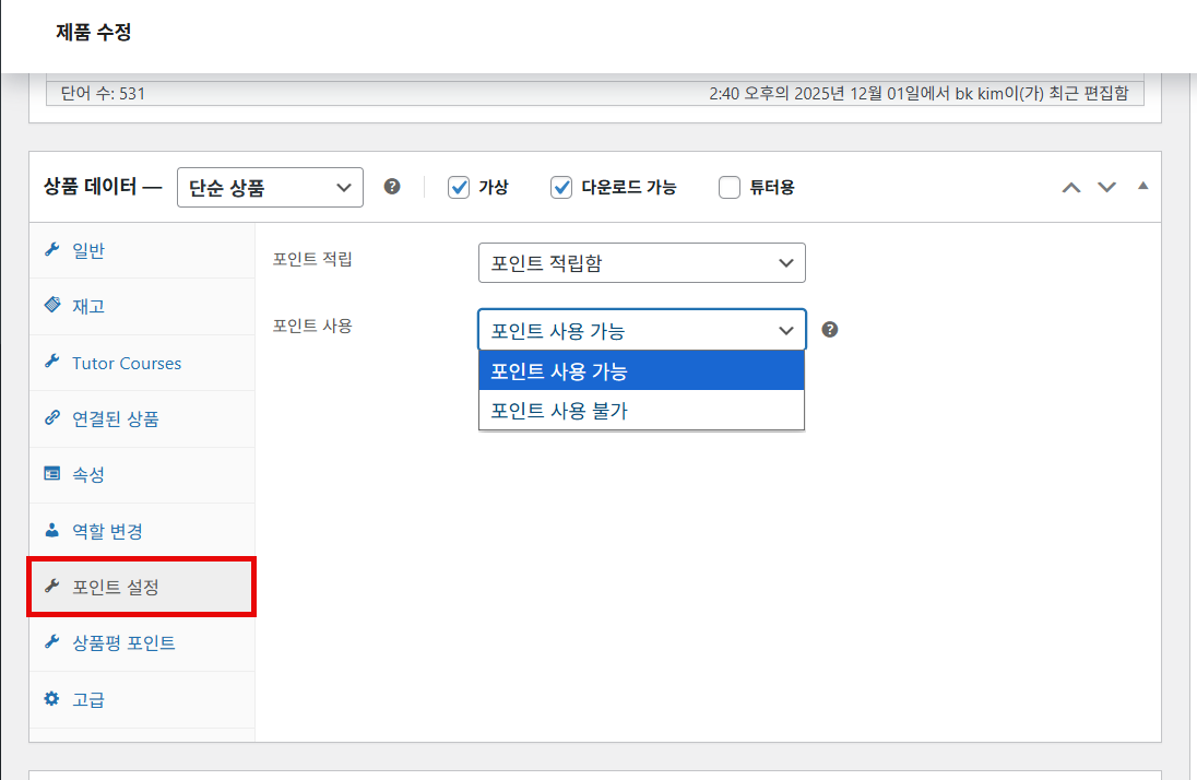 단순 상품에서는 왼쪽의 포인트 설정 메뉴를 클릭하고 포인트 사용 필드에 대하여 '포인트 사용 가능' 또는 '포인트 사용 불가' 옵션을 선택할 수 있습니다.