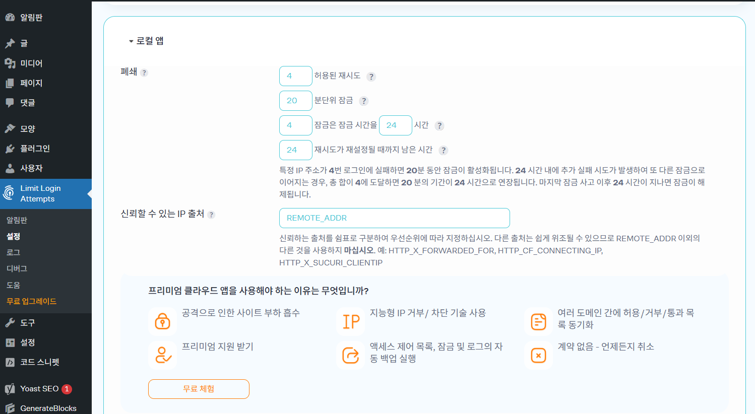 워드펜스(Wordfence)를 설치하지 않는다면 Limit Login Attempts Reloaded와 같은 플러그인을 사용하여 로그인 횟수를 제한하는 것을 고려해 볼 수 있습니다.