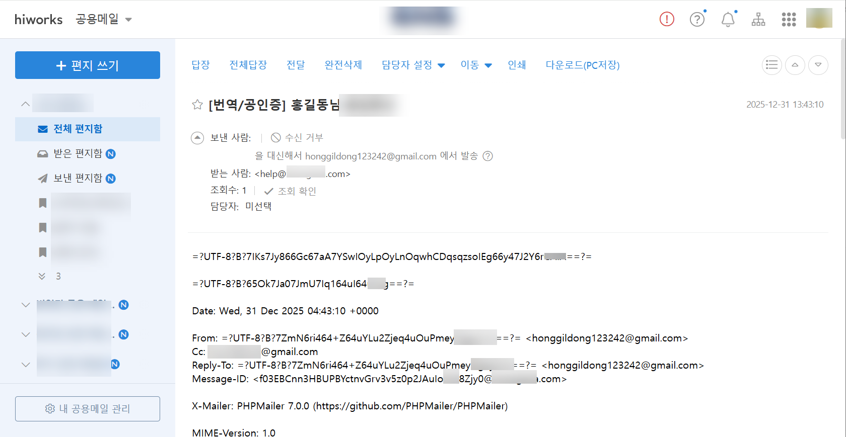 하이웍스에 로그인하여 워드프레스 문의 폼을 통해 전송된 이메일을 확인해보면 다음과 같이 이메일이 깨져서 HTML 태그로 메일 내용이 표시되었습니다.