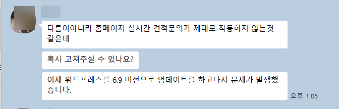 워드프레스 사이트 업데이트 후에 메일이 깨져서 들어오는 문제 해결을 맡았습니다. 워드프레스를 현재 최신 버전인 6.9 버전으로 업데이트를 하고 난 후에 홈페이지의 실시간 견적문의가 제대로 작동하지 않는 문제였습니다.