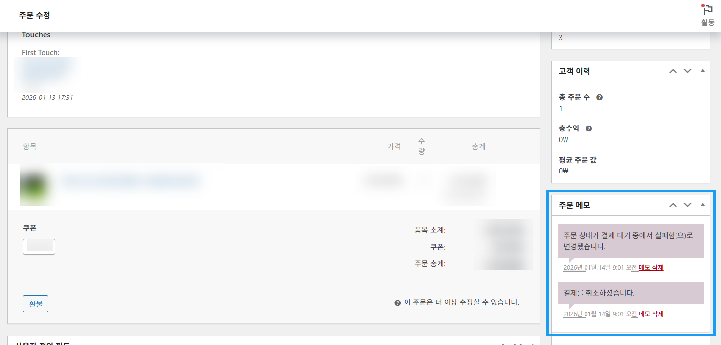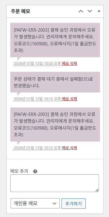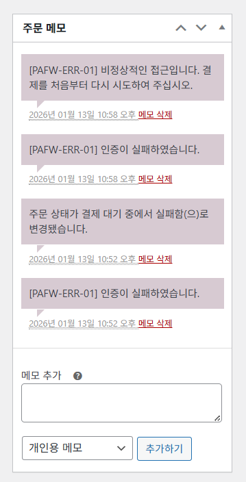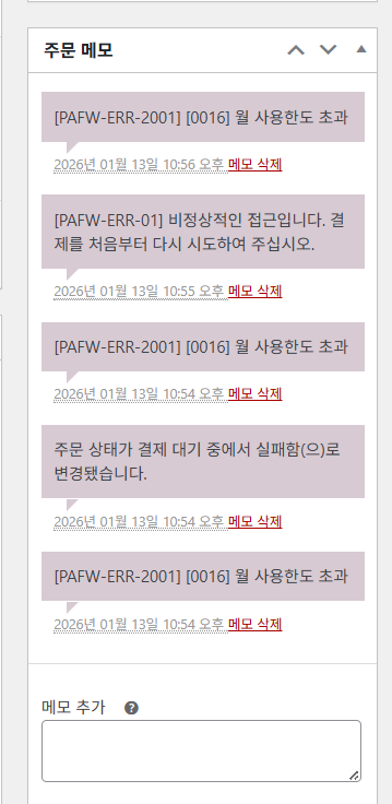 워드프레스 우커머스 주문 실패 원인 확인 방법: 주문 메모로 취소 사유 찾기