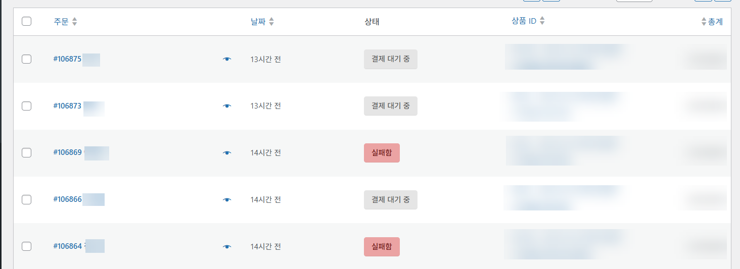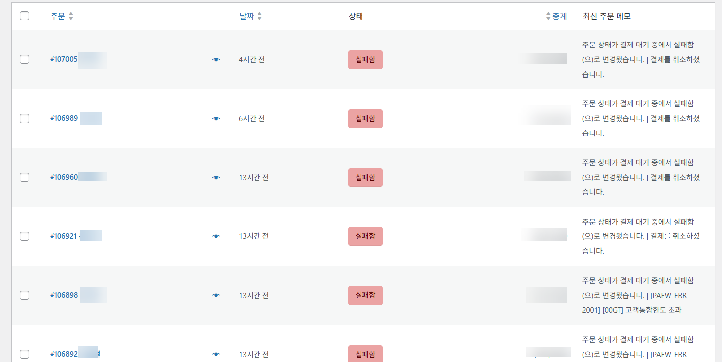 워드프레스 우커머스 쇼핑몰에서 주문 관리를 하다 보면 결제 실패 사유나 PG사 오류 메시지를 확인하기 위해 매번 개별 주문 상세 페이지에 들어가야 하는 번거로움이 있습니다. 특히 하루에