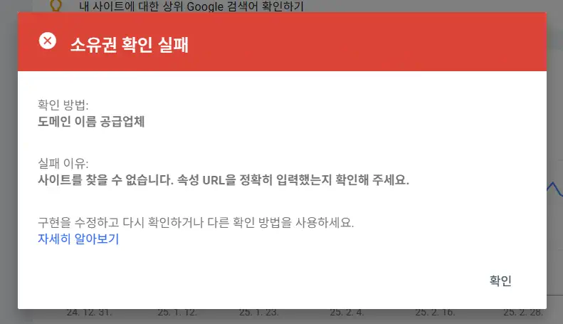 DNS 레코드를 수정하거나 변경하면 곧바로 적용되지 않고 서너 시간 정도 시간이 소요될 수 있습니다. DNS 레코드를 설정한 직후에 도메인 소유권 확인을 시도하면 아래 그림과 같이 '소유권 확인 실패' 경고 팝업이 표시될 수 있습니다.