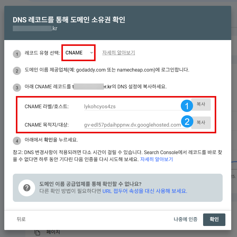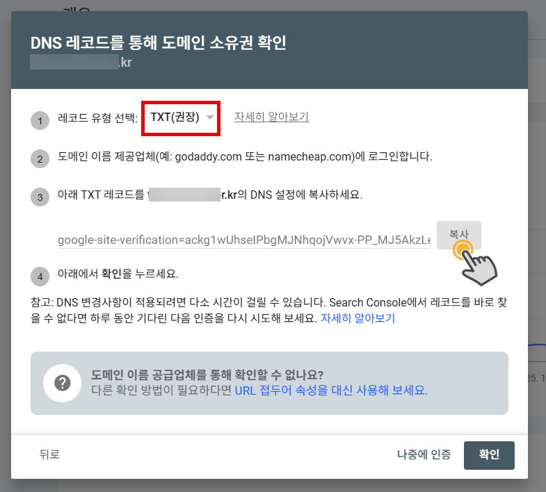 (3) DNS 레코드를 통해 도메인 소유권을 확인하는 화면이 표시됩니다. 기본적으로 TXT 레코드가 표시되며, 이 방식이 권장됩니다.