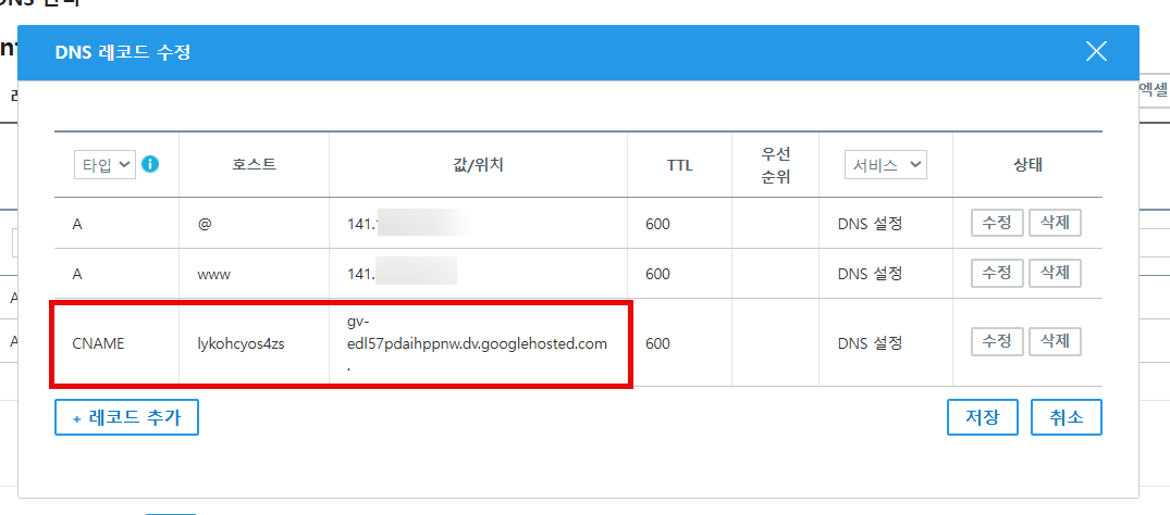 가비아에서 타입에 CNAME을 선택하고 호스트와 값에 상기에서 복사한 값들을 순서대로 입력하고, 맨 오른쪽의 수정 버튼을 누른 다음, 저장 버튼을 클릭하시기 바랍니다.