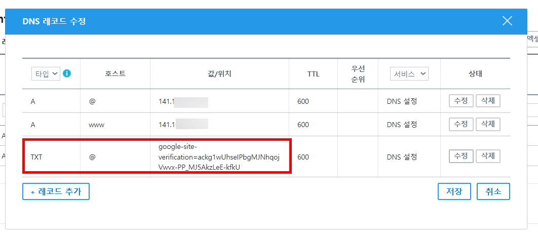 가비아에서 타입을 TXT로 선택하고 호스트에는 @, 값/위치에는 앞서 복사한 값을 붙여넣기 하고, 맨 오른쪽의 수정 버튼을 누른 다음, 저장 버튼을 눌러 변경 사항을 저장합니다.