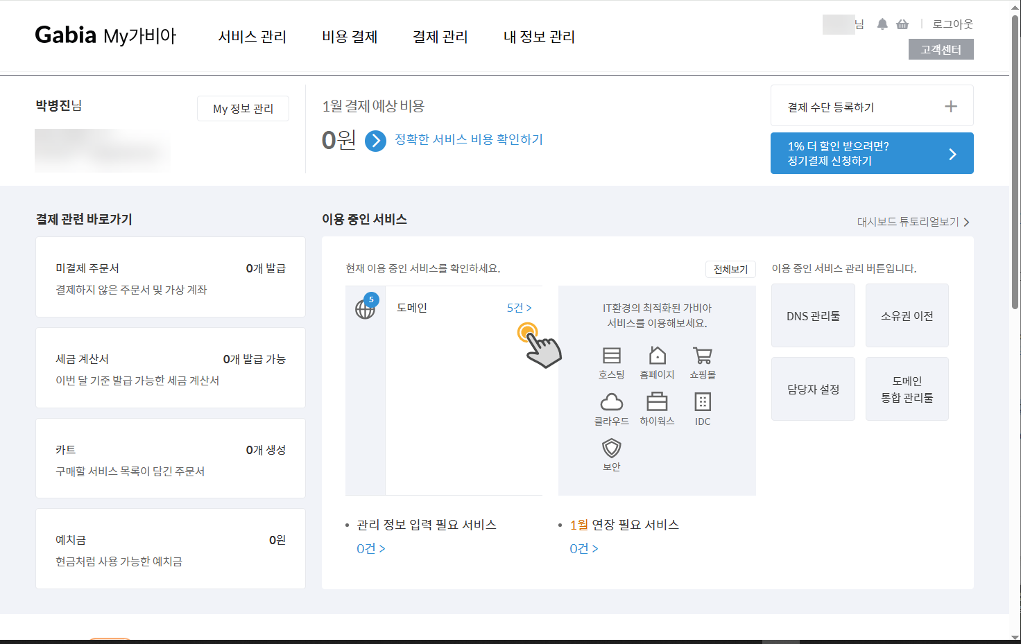 (4) 이제 가비아에 접속하여 도메인의 DNS 레코드를 설정해야 합니다. 가비아에 로그인한 다음, 이용 중인 서비스에서 도메인을 클릭합니다.