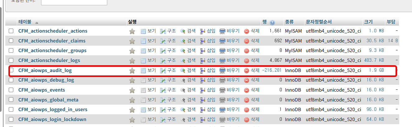 이 플러그인을 비활성화고 삭제하니 wp_aiowps_audit_log 테이블이 함께 삭제되었습니다. 대신 가벼운 BBQ 방화벽 플러그인을 설치하고 상기에서 언급한 로그인 재시도 제한 플러그인을 설치했습니다.